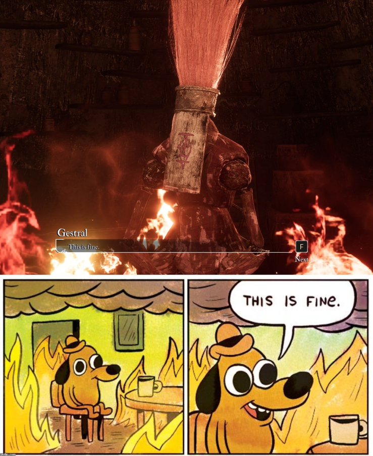 Na Vila Gestral, é possível encontrar um NPC Gestral sentado em uma barraca que está pegando fogo no interior. Ao interagir com ele, sua única resposta é: “Está tudo bem” (“This is fine”), uma referência direta a um dos memes mais famosos da internet.